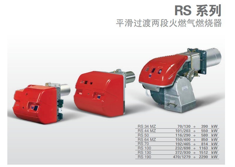 ?RS系列燃燒器的出力范圍為45~2290kW,適用于中低溫的熱水鍋爐、熱風及蒸汽鍋爐和導熱油爐。 此系列燃燒器的運行模式為“平滑兩段火”;燃燒器安裝有微處理器控制面板,可顯示運行狀態及診斷故障原因。 風機和燃燒頭性能的提升保證了燃燒器