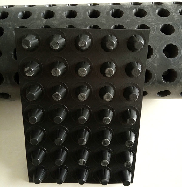 圓錐突臺(tái)(或中空?qǐng)A柱形多孔)的塑膠底板,由高抗沖聚苯乙烯(HIPS)制成。圓錐突臺(tái)(或中空?qǐng)A柱多孔)的頂面膠接一濾層土工布,以阻止泥土微粒通過,從而避免通道阻塞,使孔道排水順暢。